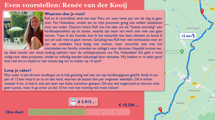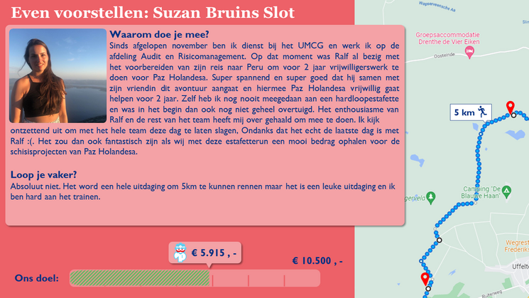 Renée is momenteel bezig met het einde van haar promotietraject; daarna vertrekt ze samen met Ralf naar Peru om aan de slag te gaan bij Paz Holandesa. Hardlopen zit in de familie dus het lopen van deze estafette moet zeker goedkomen. De andere deelnemer is Suzan. Ze werkt sinds afgelopen november bij het Team Audit en Risicomanagement. Voor Suzan is het hardlopen geheel nieuw maar toch doet ze mee!